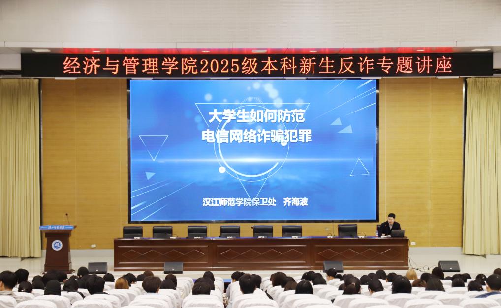 为提升新生防范电信诈骗意识,筑牢平安校园,10月23日下午3点半,经济与管理学院在学术报告厅召开2025级新生反诈专题讲座,此次讲座由保卫处齐海波老师主讲,辅导员王旭、2025级全体本科新生参加。