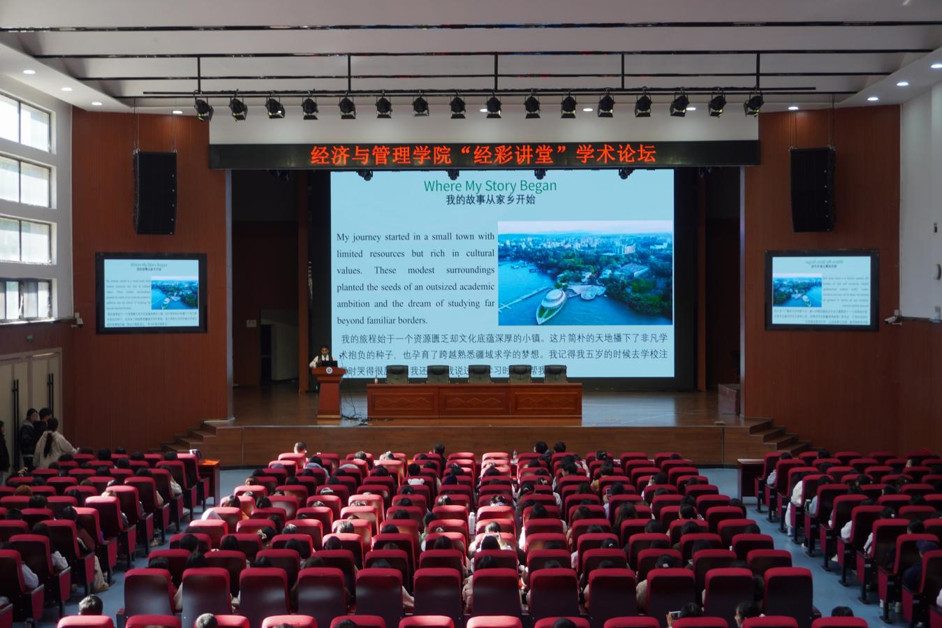 11月20日下午,经济与管理学院“经彩讲堂”在丹江口校区沧浪剧场成功举办。学院外籍教师Addis Amsalu Kendu博士担任主讲嘉宾,院党委副书记张宇、大数据与会计专业负责人崔建忠、财务管理专业教师吴嵩及辅导员王菁、张涵出席,300余名师生现场聆听。