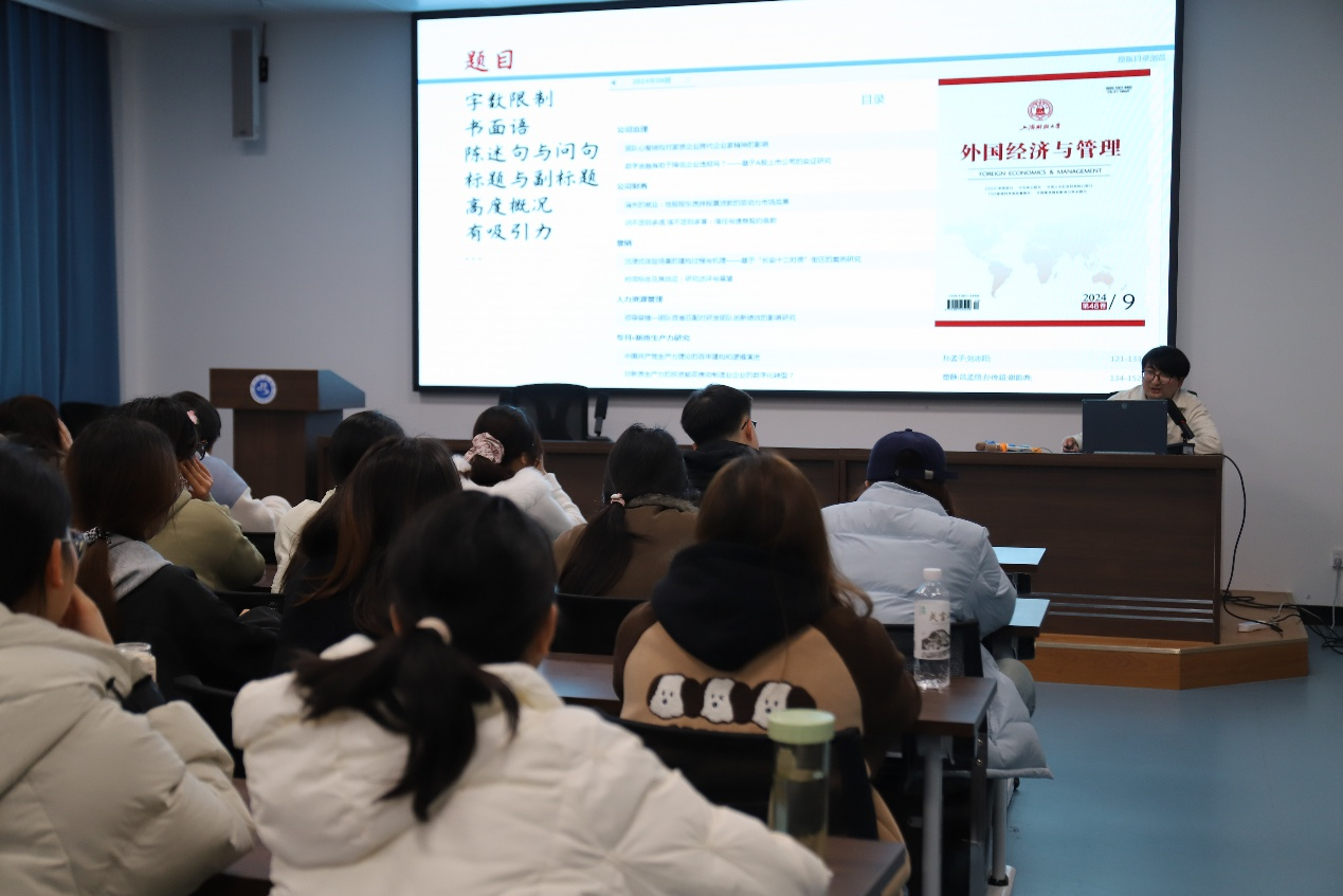 讲座中,吴键老师结合自身丰富的科研与指导经验,围绕论文格式展开细致讲解,从论文题目拟定、摘要与关键词撰写,到引言、理论与文献述评、研究设计、结果分析、结论与讨论、启示与展望等模块逐一拆解,重点讲解了变量设置、模型构建与数据处理,并结合信度与效度分析、结构效度分析方法,指导学生如何保障问卷数据的可靠性与有效性。此外,他还分享了SOR模型、ABC态度模型等理论模型在经管领域研究中的应用,为同学们构建研究框架提供了新思路。
